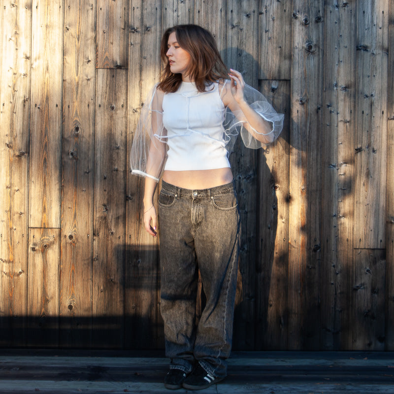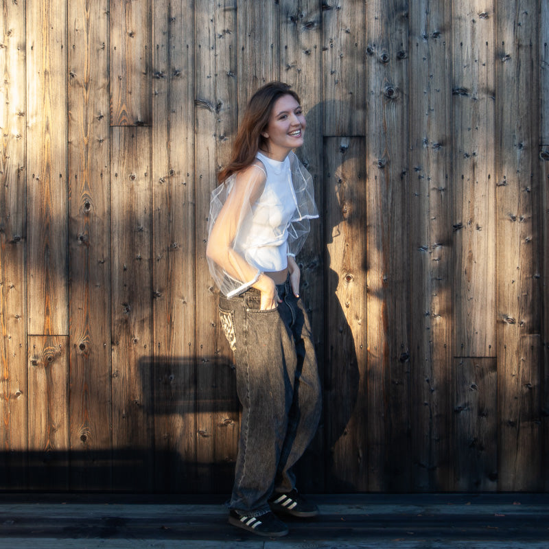 Chemisier court et féminin en tulle recyclé, avec un joli drapé sur la poitrine. Manches larges. Idéal à porter sur un débardeur ou sous un gilet.